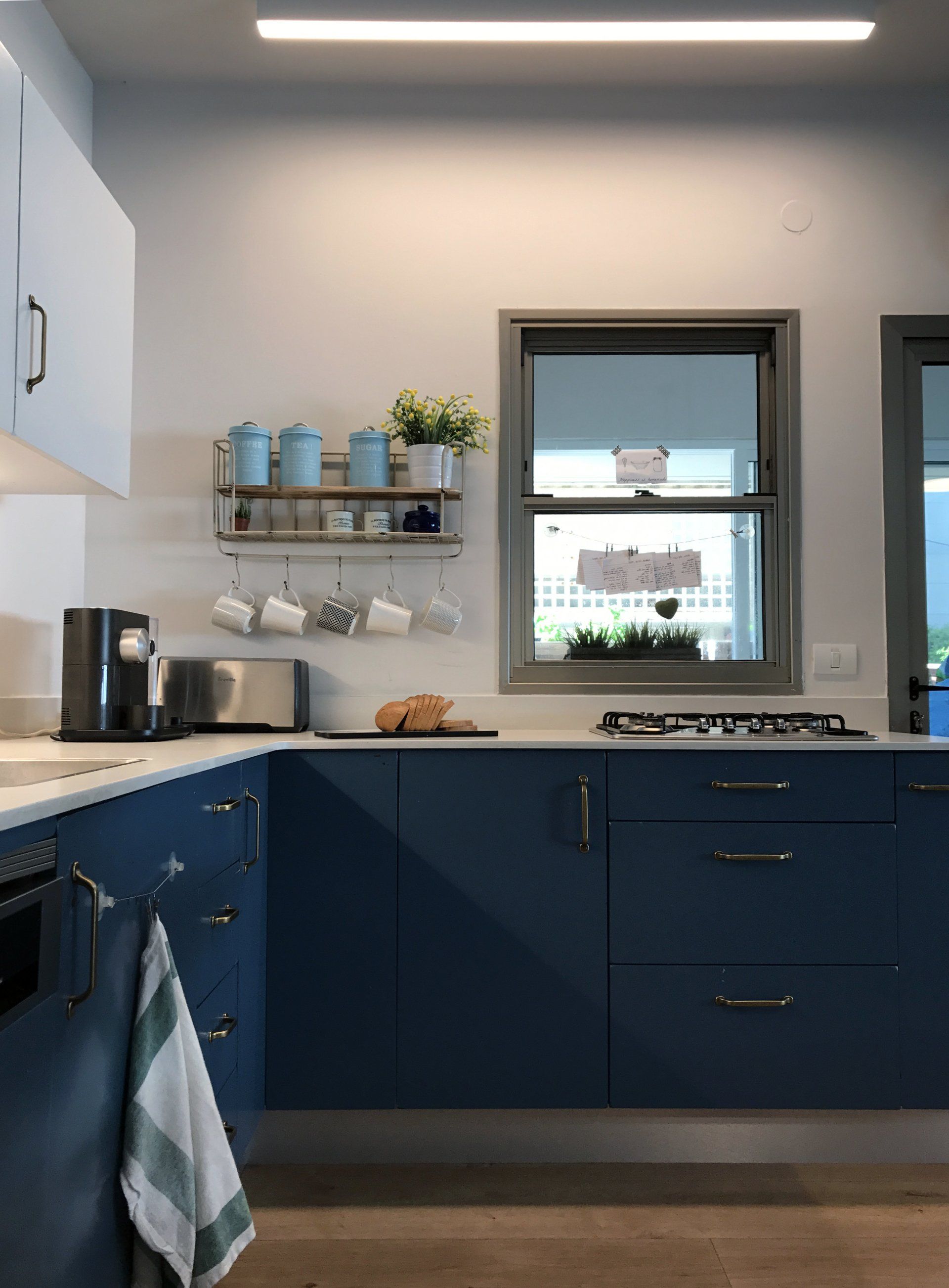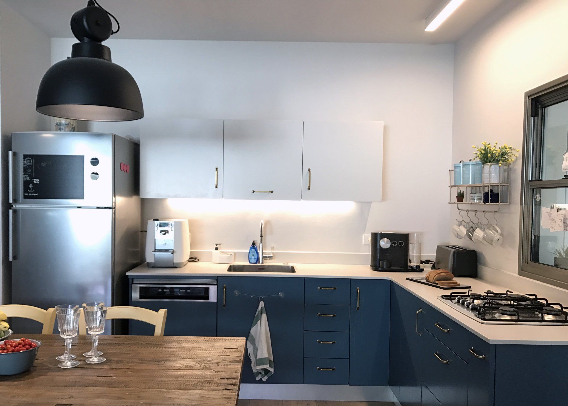 באמצעות שבירת קיר הטלוויזיה שתחם את המטבח, נפתח המרחב והחלל תוכנן מחדש. המטבח הישן עבר צביעה מחדש, והוגדר קיר דקורטיבי במעבר בין החללים.